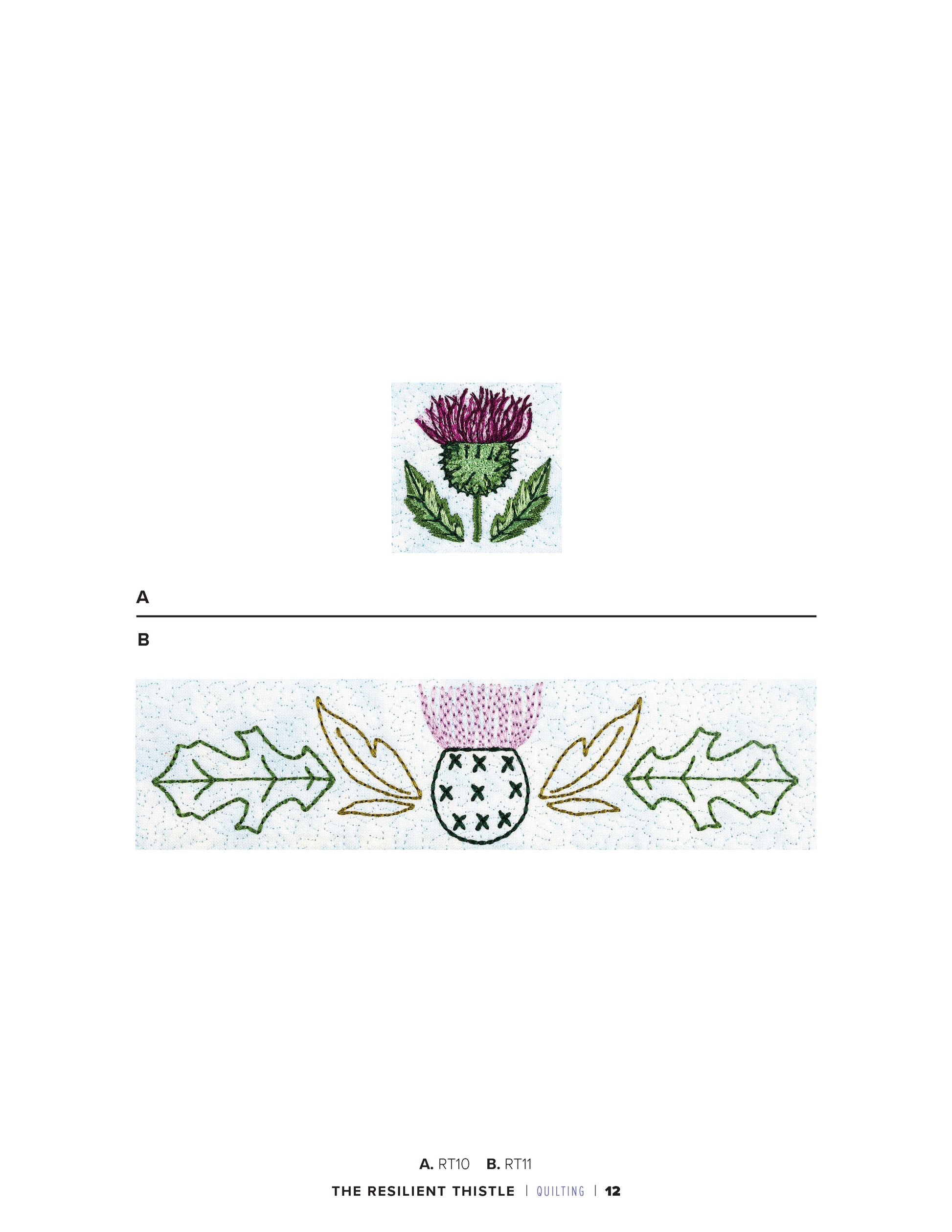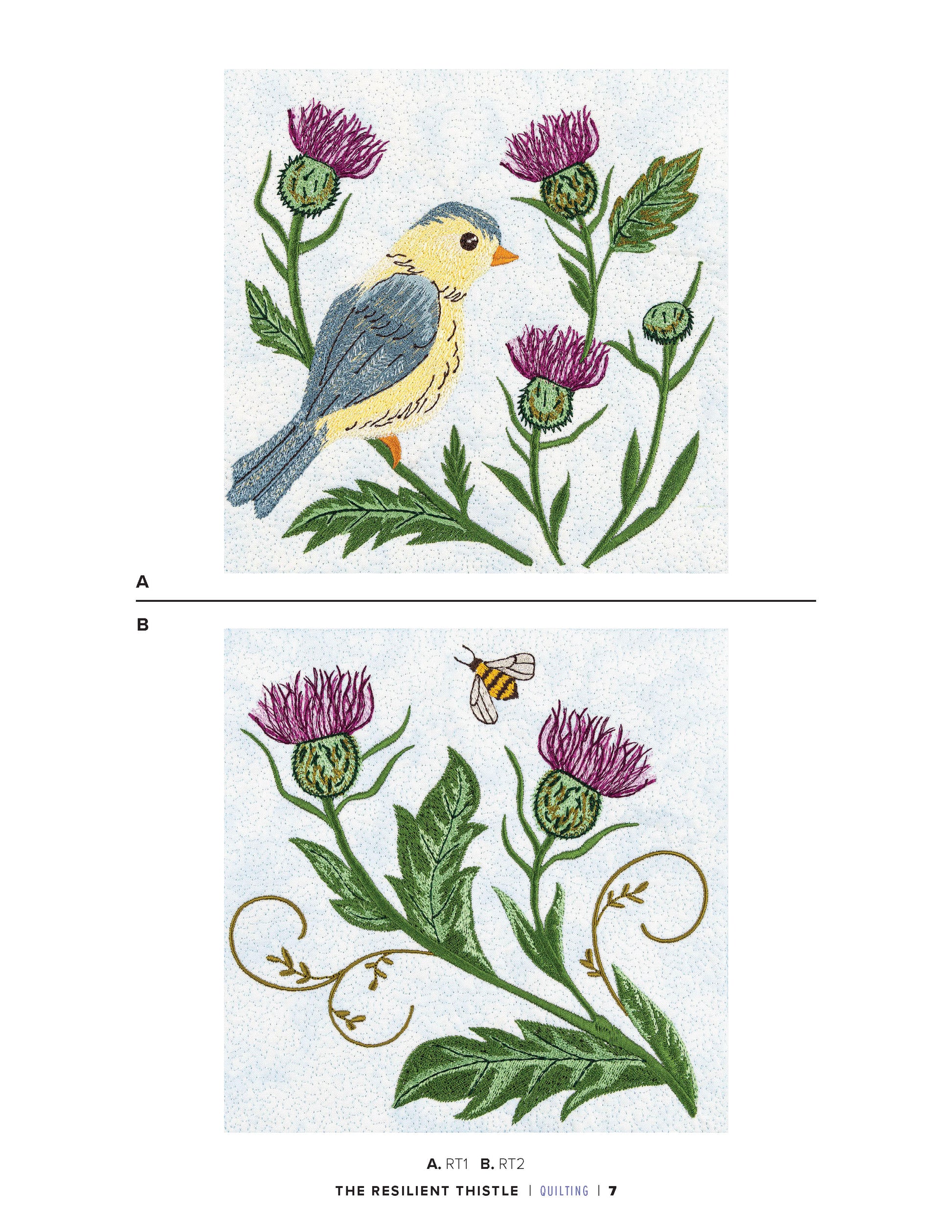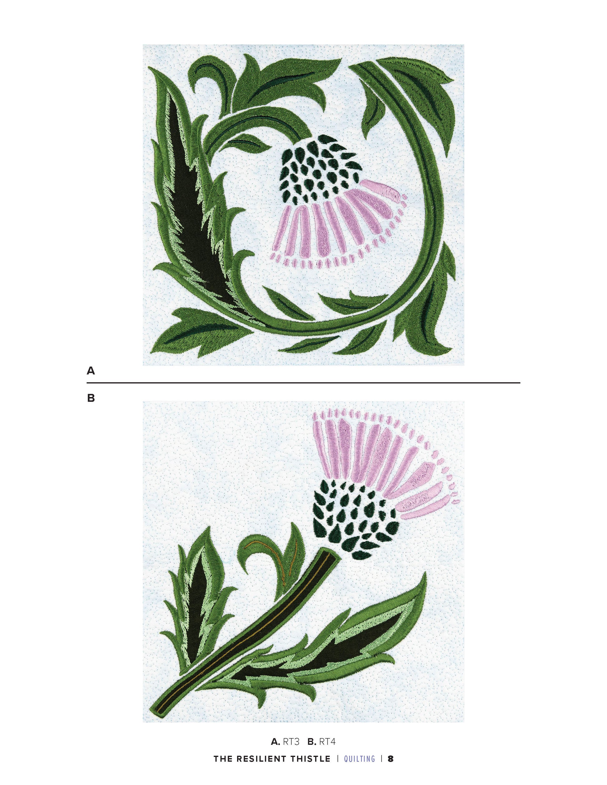 In the Resilient Thistle collection, you will find 11 exquisite designs that capture the essence of this remarkable flower. Each design is thoughtfully crafted, showcasing a variety of quilting techniques. From free motion stitching that adds a touch of whimsy to hidden appliqué that reveals the flower's beauty, and traditional embroidery that highlights its intricate details, these designs offer endless possibilities for your quilting projects.
