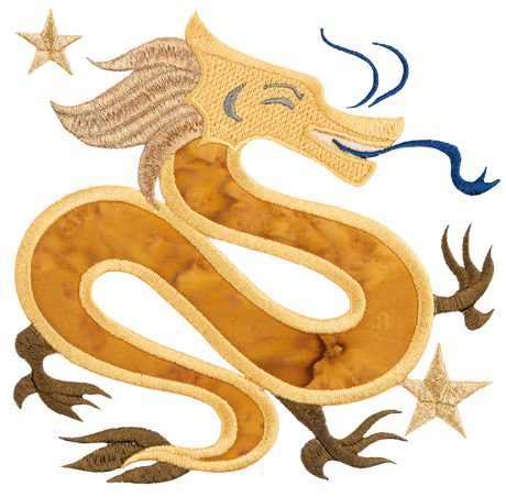 is believed to be from the celestial heavens. With just one simple standard appliqué making up the dragon’s meandering body and a few surrounding embroidered details, this design promises to stitch out quick.