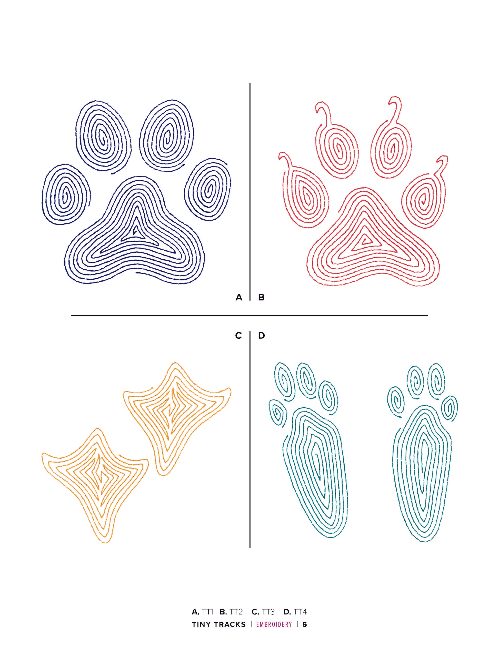 These charming, 4x4-friendly designs were digitized with repeating, echo stitched lines that illustrate a series of adorable little animal prints. Whether you love dogs, ducks, or even deer, let these cute prints wander over a finished project by staggering and repeating the same design.