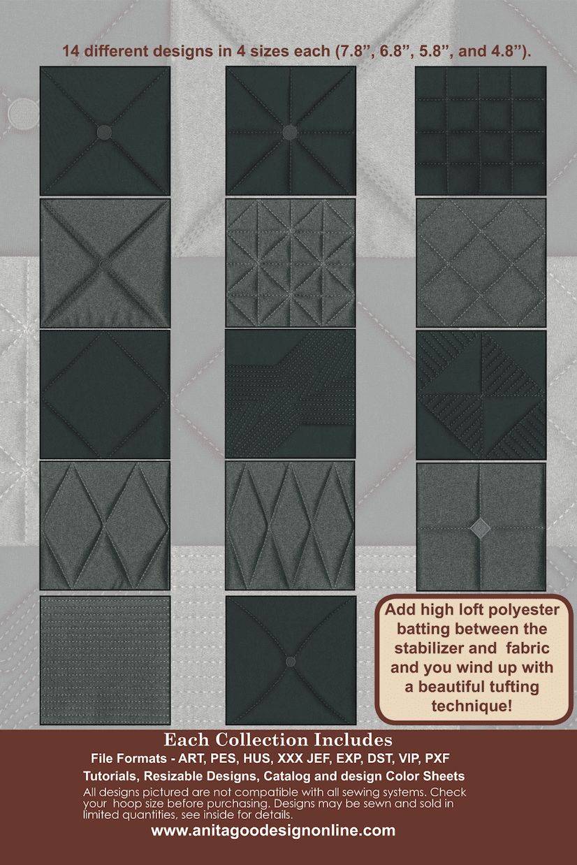 For this Quilting Club bonus I wanted to design something both modern and unique. What better way is there to try something new than with a bonus collection! This collection consists of 14 different tufted quilt blocks. That when stitched together create beautiful quilts or pillows that no one will realize were created on your embroidery machine. The technique is similar to trapunto without the cutting. You simply add high loft polyester batting between the stabilizer and fabric and you wind up with a beautiful tufting technique. We used grey jersey fabric for our blocks but you can use any stretch fabric. . The step by step tutorial will demonstrate how to create the blocks. Each of the designs in this collection comes in 4 different sizes. This allows you to create a quilt of any size, using any hoop 5x7 or larger. This collection is also compatible with all of our other Mix & Match Quilting Collections. You can combine the blocks from this collection with Foundations, Jelly Roll, Butterflies & Bees and many more The designs are perfect for creating stunning quilts and pillows that are sure to be conversation starters. With the Mix & Match Quilting Collections, you can further customize your quilt and create personalized projects that reflect your unique style.