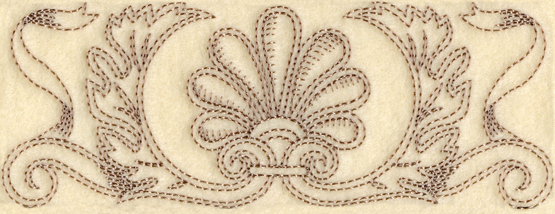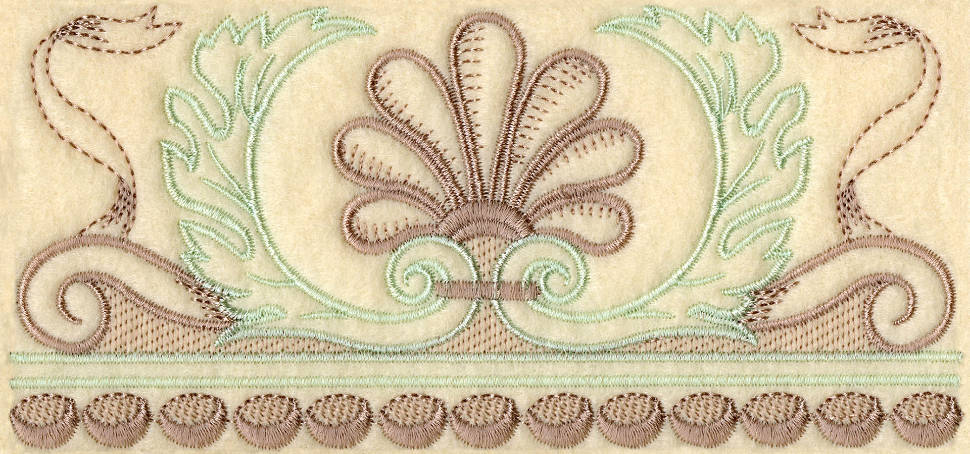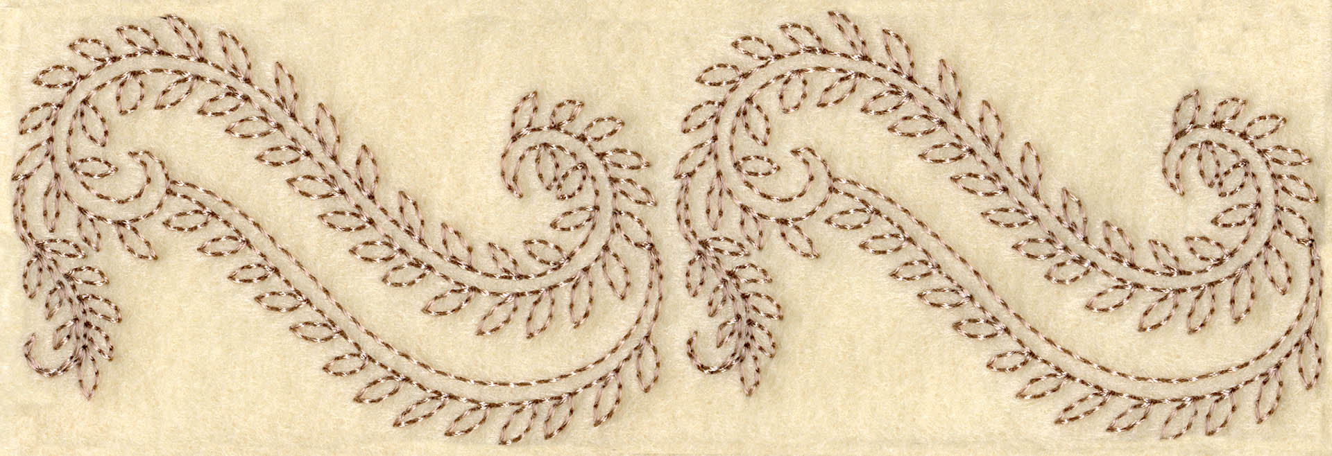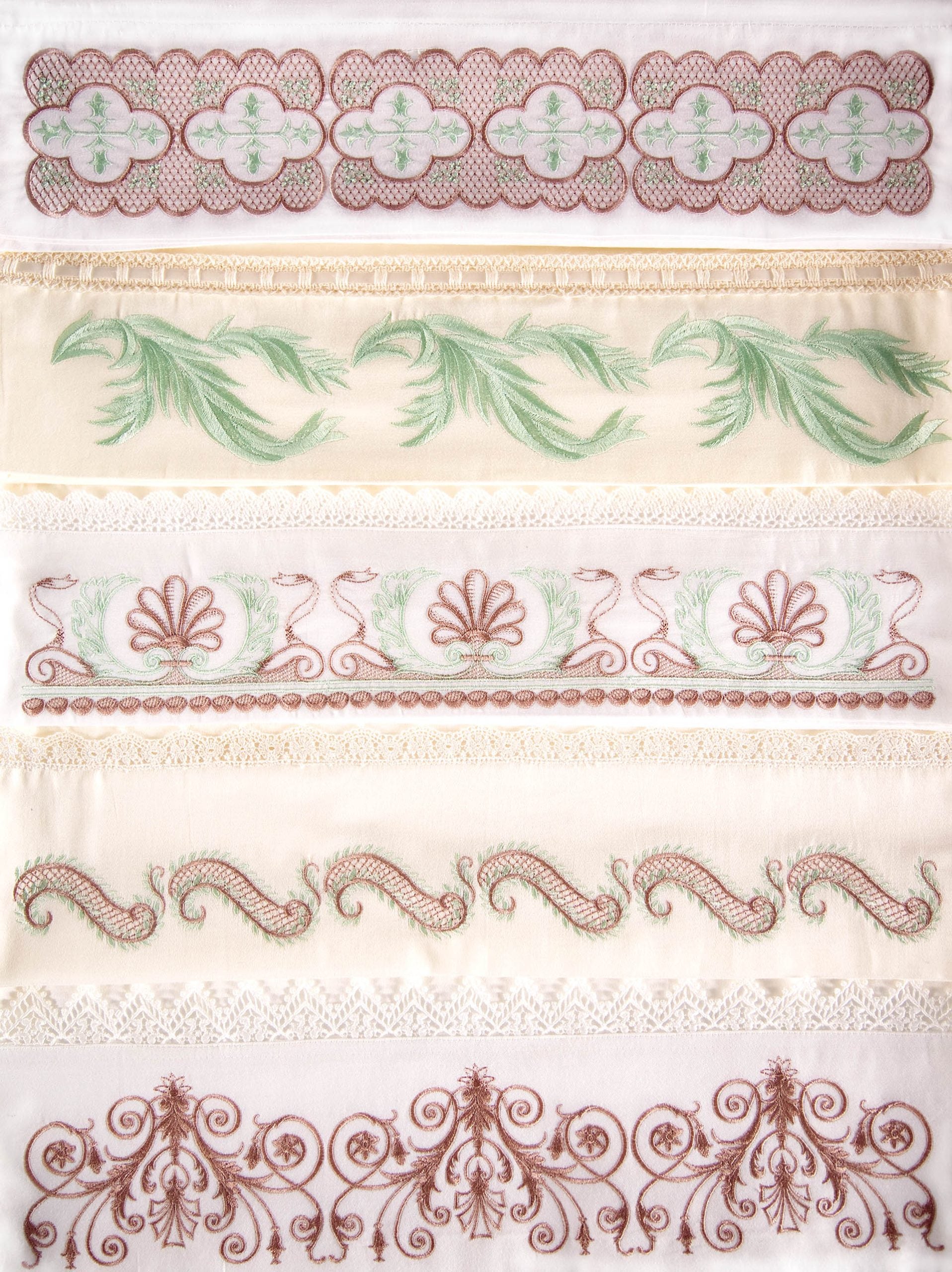 Welcome to the next installment of our Vintage series. This collection is called Vintage Borders and they will look beautiful embroidered on table linens, sheets, pillow cases or even on garments. There are 20 different designs and each is digitized in two different ways. The first way is with standard stitching and the second version is digitized as running stitches. These designs look beautiful when embroidered tone on tone, but for our examples we used sage and tan colors, using these colors allows you to see the detail in the designs. Since this is a border collection we digitized a basting stitch with all of the designs that were meant to connect. If you have never done a continuous border design before, don’t fear! We’ve included a tutorial that will demonstrate the process step by step. If you don’t want to make the borders continuous, simply skip the first thread color, which is the basting stitch. Not all of the designs are continuous; some of them are corner or motif elements.