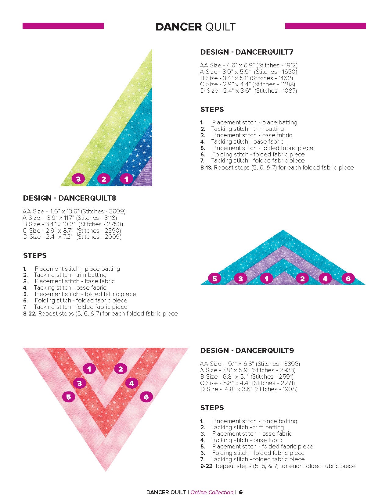 Our dancers move gracefully throughout these online designs with their fluid movements and fun poses, illustrating that dancers don’t need wings to fly! Use the unique quilt blocks to create a diamond shaped quilt, or combine the border and corner blocks to square off your quilt. In addition to the 6 diamond blocks and 3 finishing blocks, we have also included all 6 dancers as isolated embroidery designs. These embroidered dancers will look great on tote bags, leotards, or framed as wall art in your dancer’s bedrooms.
